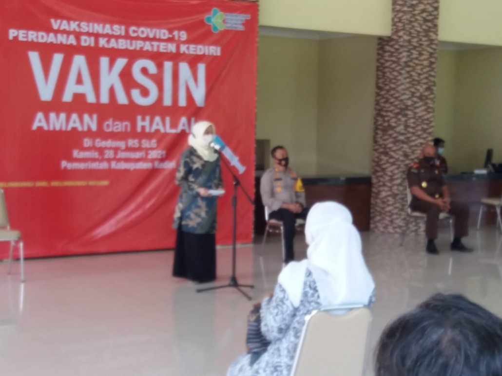 Bupati Kediri dr. Hj. Haryanti Sutrisno dalam sambutannya menyampaikan “Hari ini merupakan hari yang bersejarah bagi kita karena pagi ini kita akan melaksanakan vaksin yang seterusnya akan di laksanakan oleh tenaga medis semoga kita terhindar dari segala penyakit Covid-19,” ungkapnya.