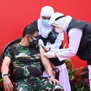Pangdam V/Brawijaya Mayjen TNI Suharyanto, S.Sos., M.M. menerima vaksinasi Covid-19 tahap kedua di Halaman Kantor Gubernur Jatim (taman) Jl. Pahlawan No. 110, Surabaya. Kamis, 28 Januari 2021.