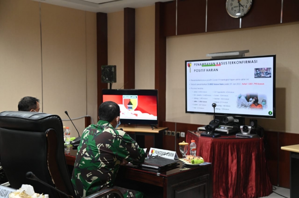 Pangdam V/Brawijaya Mayjen TNI Suharyanto, S.Sos., M.M. mengikuti Rapat Koordinasi Tingkat Menteri bersama Mendagri, Menkes, Menag, Kapolri, Kasad dan Ka BNPB tentang Penegakan Disiplin Protokol Kesehatan dan Penanganan Covid-19 melalui Video Conference di Ruang Puskodalopsdam V/Brawijaya, Makodam V/Brawijaya, Surabaya. Sabtu, 30 Januari 2021.