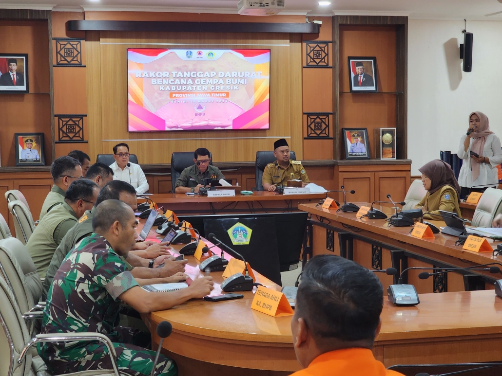 Gresik,- kegiatan Rapat Koordinasi Tanggap Darurat Bencana Alam Gempa Bumi yang dihadiri oleh sekitar 100 orang peserta di Kabupaten Gresik, pada Senin, 25 Maret 2024 di ruang rapat Graita Eka Praja Lantai II Pemkab Gresik Jl. Dr. Wahidin Sudirohusodo Kec. Kebomas Kab. Gresik Jawa Timur. Kegiatan ini dipimpin oleh Letjen TNI Suharyanto, S.Sos, M.M (Kepala BNPB) dengan penanggung jawab Bpk. H. Fandi Ahmad Yani SE (Bupati Gresik).