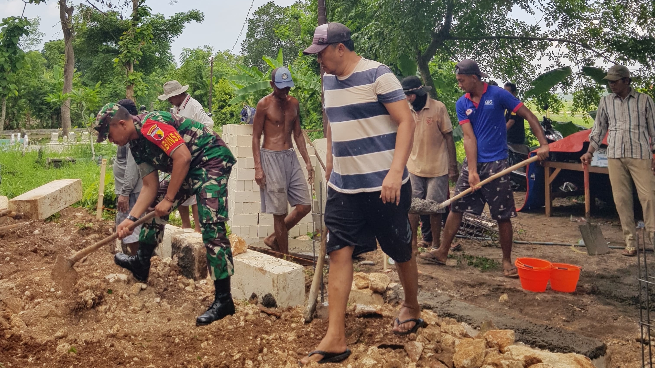 Bangkalan,– Babinsa Serda Mustain bersama anggota Koramil 0829/02 Socah dan warga binaan di Desa Buluh, Kecamatan Socah, menunjukkan kekompakan mereka dalam kegiatan gotong royong membangun fasilitas tempat peralatan jenazah dan kamar mandi di pemakaman umum Dusun Buluh Bawah.