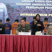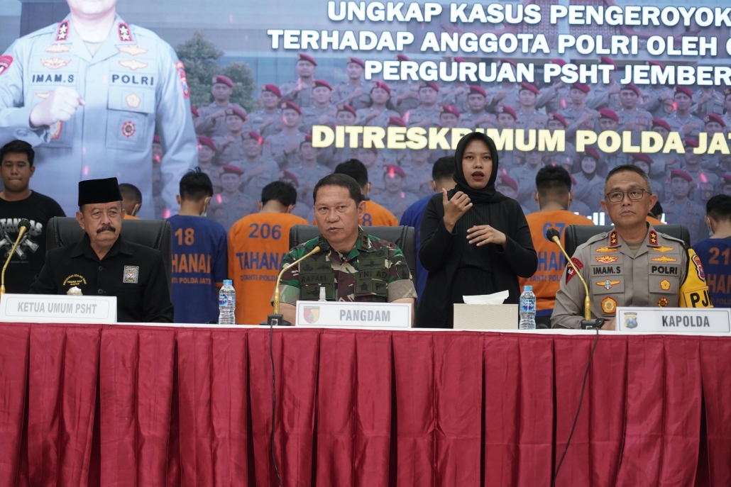 Surabaya,- Pangdam V/Brawijaya Mayjen TNI Rafael Granada Baay menegaskan penegakan hukum yang tegas atas kasus pengeroyokan terhadap anggota polisi oleh anggota Persaudaraan Setia Hari Terate (PSHT) Jember. Hal ini disampaikan Pangdam saat menghadiri konferensi pers di Gedung Mahameru Mapolda Jatim, Kamis (25/7/2024).