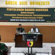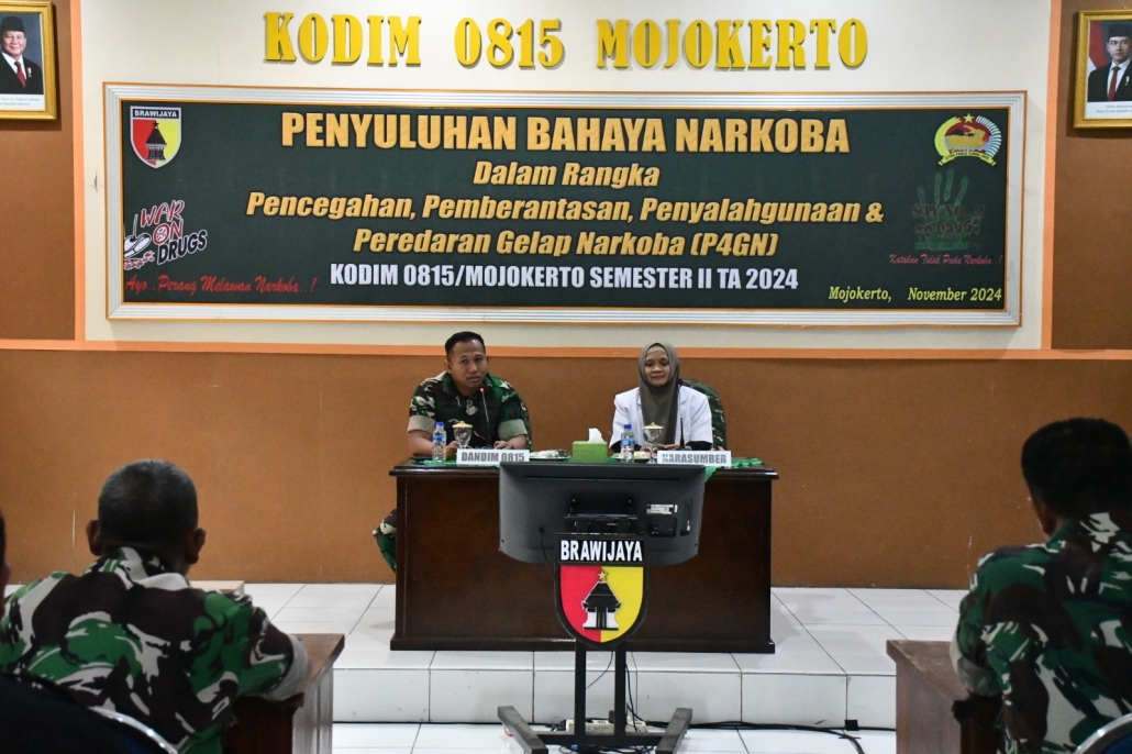 Mojokerto,— Dandim 0815/Mojokerto Letkol Inf Rully Noriza, S.I.P., M.I.P., membuka kegiatan penyuluhan tentang Pencegahan, Pemberantasan, Penyalahgunaan, dan Peredaran Gelap Narkoba (P4GN) di Makodim 0815, Rabu (13/11/2024). Kegiatan ini merupakan langkah strategis untuk memerangi narkoba.
