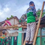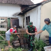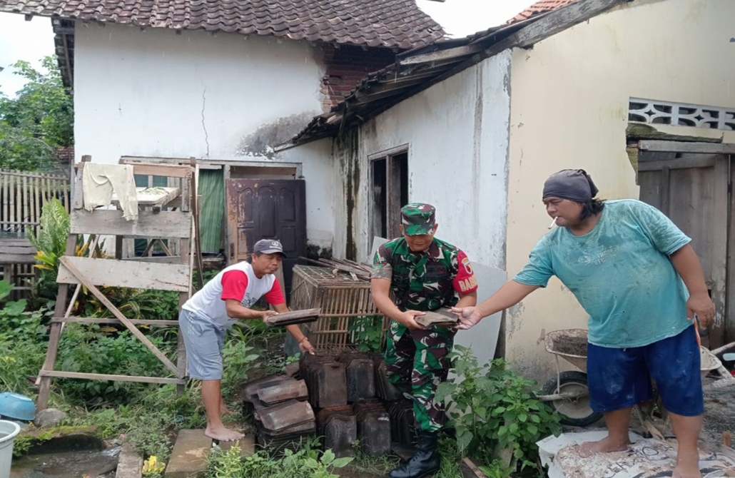 Babinsa Koptu Arif Yulianto bersama warga setempat, bahu-membahu memperbaiki rumah milik Pak Boniran, seorang warga kurang mampu yang tinggal di rumah tersebut yang mengalami kerusakan pada atap dan dinding yang membahayakan penghuninya terutama saat musim hujan tiba.