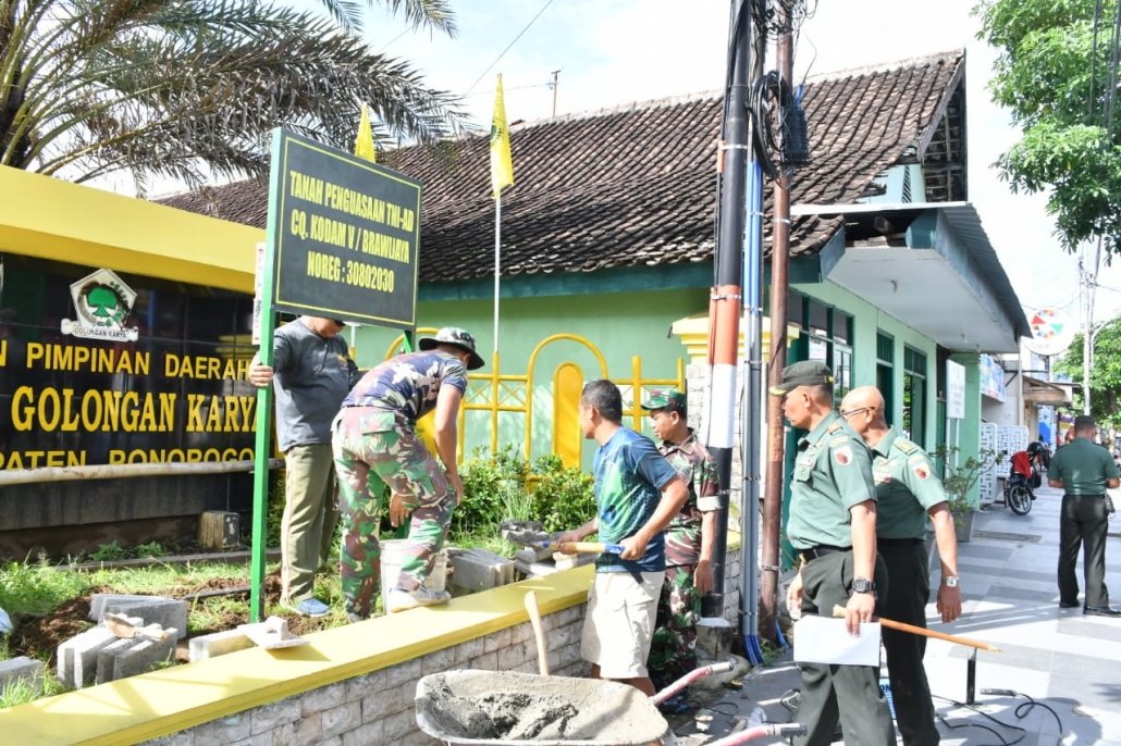 Ponorogo,- Komandan Kodim 0802/Ponorogo Letkol Inf Dwi Soerjono memimpin Pemasangan Papan (plang) tanah penguasaan TNI AD yang ada di depan Kantor DPD Golkar Jl. Jend. Sudirman No. 66 Kota/Kabupaten Ponorogo, Selasa (10/12/2024).