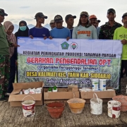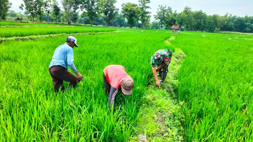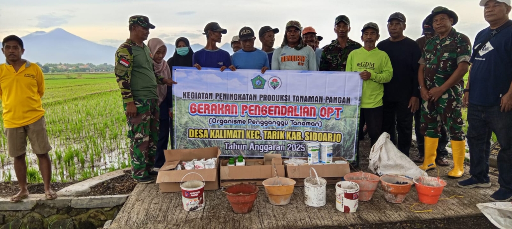 Sidoarjo,- Dalam mensukseskan program Pemerintah guna meningkatkan ketahanan pangan, Danramil 0816/11 Tarik Lettu Inf Yahman beserta anggota melaksanakan pendampingan Kelompok Tani Sumber Bahagia warga masyarakat Desa Kalimati Kec Tarik Kab. Sidoarjo dalam rangka pengendalian OPT (Organisme Pengganggu Tanaman) terutama tanaman padi.