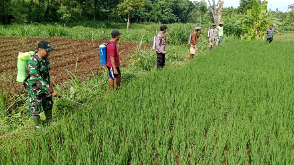 “Penyemprotan ini guna mengantisipasi hama ulat maupun wereng. Selain itu juga untuk memberikan kesuburan terhadap batang padi serta menghilangkan rumput ilalang yang bakal tumbuh di sekitar tanaman padi,” ucap Babinsa.