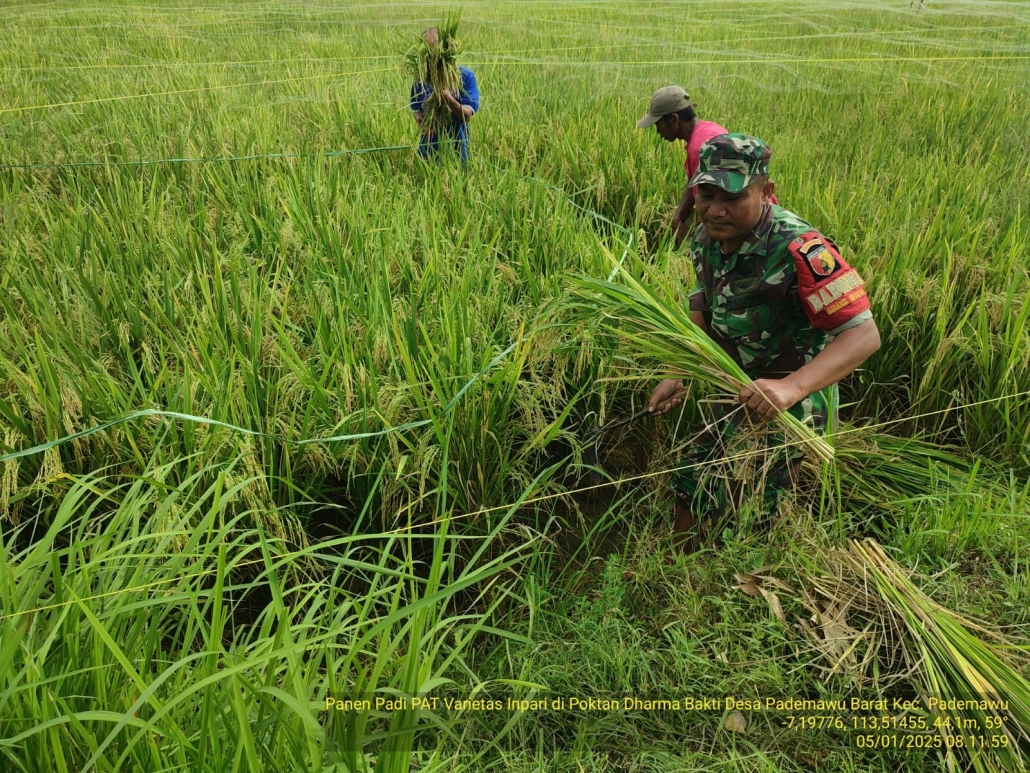 PAMEKASAN – Babinsa Pademawu Barat, Serma Masagung Budi Wijaya Kusuma, bersama PPL Pademawu Barat, Heri, melaksanakan panen padi di sawah milik Admoyadi (54), Ketua Kelompok Tani (Poktan) Dharma Bakti, di Dusun Dharma, Desa Pademawu Barat, Kecamatan Pademawu, Kabupaten Pamekasan, pada Minggu (5/1/2025).