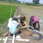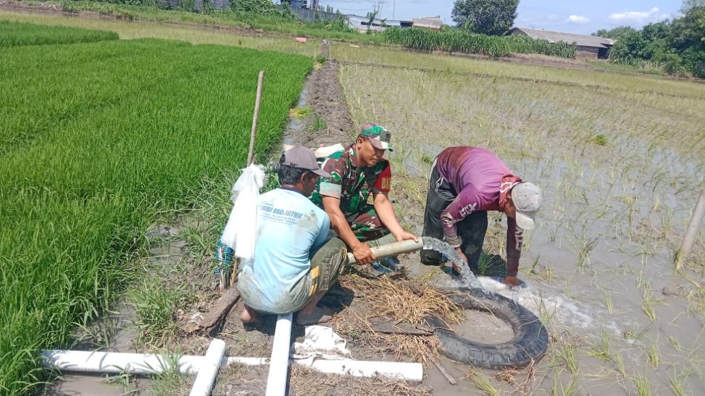 Gresik,– Babinsa Koramil 0817/02 Wringinanom Kodim Gresik, Serka Aan Hendrawan, bersama para petani melaksanakan kegiatan pengairan sawah melalui pompanisasi di Desa Lebaniwaras, Kecamatan Wringinanom, Kabupaten Gresik.