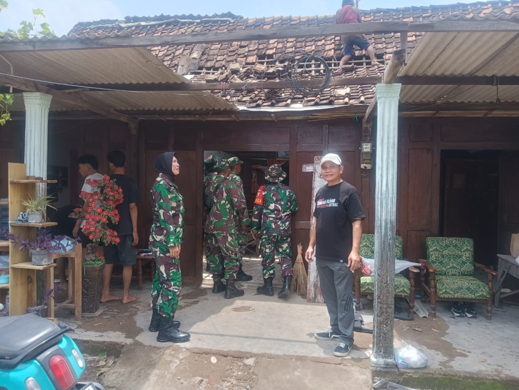 Magetan,– Anggota Koramil Maospati dipimpin langsung Danramil Kapten CBA ( K ) Dyah Nilasari S.Sos bersama pemerintah setempat dan warga bergotong royong memperbaiki atap rumah warga pasca bencana angin kencang yang terjadi di Desa Kolagen Gambiran Kecamatan maospati Kabupaten Magetan.