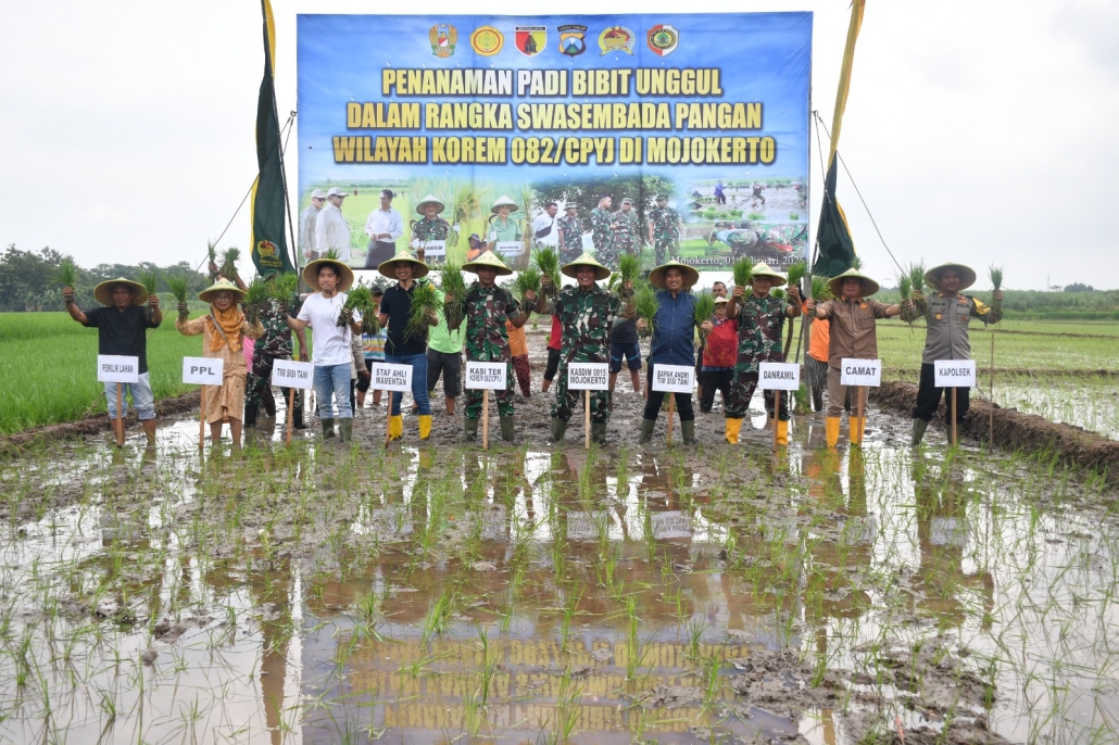 Mojokerto, – Dalam rangka mendukung program pemerintah mewujudkan swasembada pangan, Korem 082/CPYJ bersama Kodim 0815/Mojokerto menggelar kegiatan penanaman padi bibit unggul di Dusun Genukwatu, Desa Modongan, Kecamatan Sooko, Kabupaten Mojokerto, Jawa Timur, Sabtu (01/02/2025).