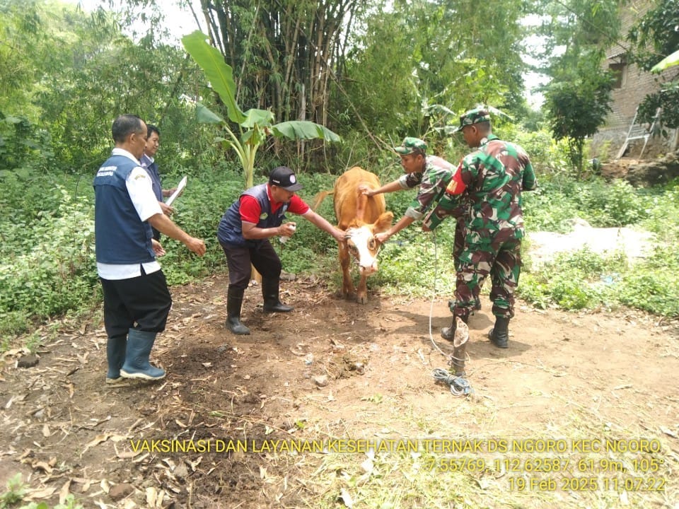 Mojokerto, – Sebagai langkah antisipasi penyebaran Penyakit Mulut dan Kuku (PMK) pada hewan ternak sapi dan kambing, Babinsa Ngoro Koramil 0815/12 Ngoro Kodim 0815/Mojokerto Serda Choirul Huda dampingi kegiatan vaksinasi pada hewan ternak di Desa Ngoro, Kecamatan Ngoro, Kabupaten Mojokerto, Jawa Timur.