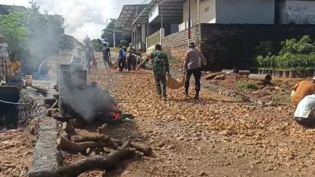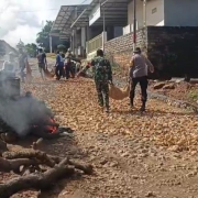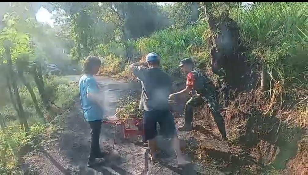 Tindakan selanjutnya yang dilakukan Koptu Sunaryo yaitu melakukan koordinasi dengan unsur terkait baik itu Polsek Ngebel, perangkat desa serta masyarakat untuk melaksanakan kerja bakti mengangkat longsoran tanah serta membersihkan puing – puing tembok yang ambrol tersebut.