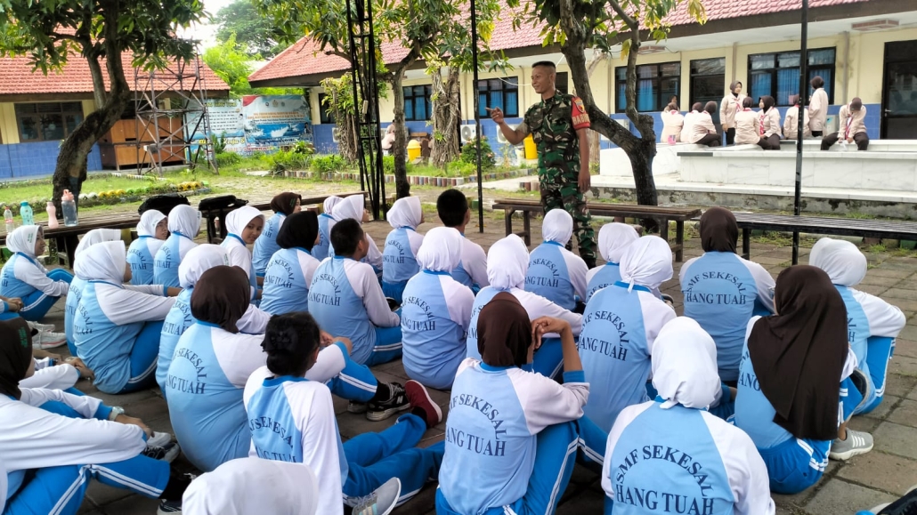Surabaya,— Dalam rangka menumbuhkan semangat cinta tanah air dan kedisiplinan generasi muda, Babinsa Kelurahan Gunungsari Koramil 0830/19 Karangpilang, Serda Bambang Purwanto dan Koptu Achmad Faul, melaksanakan kegiatan pembinaan kepada siswa-siswi Smk Farmasi Sekesal Hang Tuah, Kelurahan Gunungsari, Kecamatan Dukuh Pakis, Surabaya.