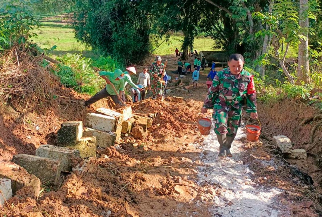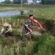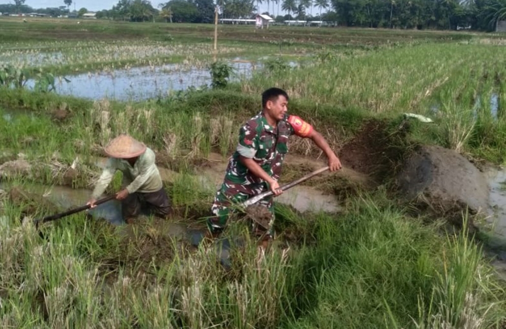 Kegiatan yang dilaksanakan di atas lahan seluas 8 are ini merupakan bagian dari upaya penyiapan lahan untuk ketahanan pangan nasional. Koptu Moch Gunawan bersama warga kelompok tani bahu membahu mengolah tanah agar siap ditanami padi dalam waktu dekat.