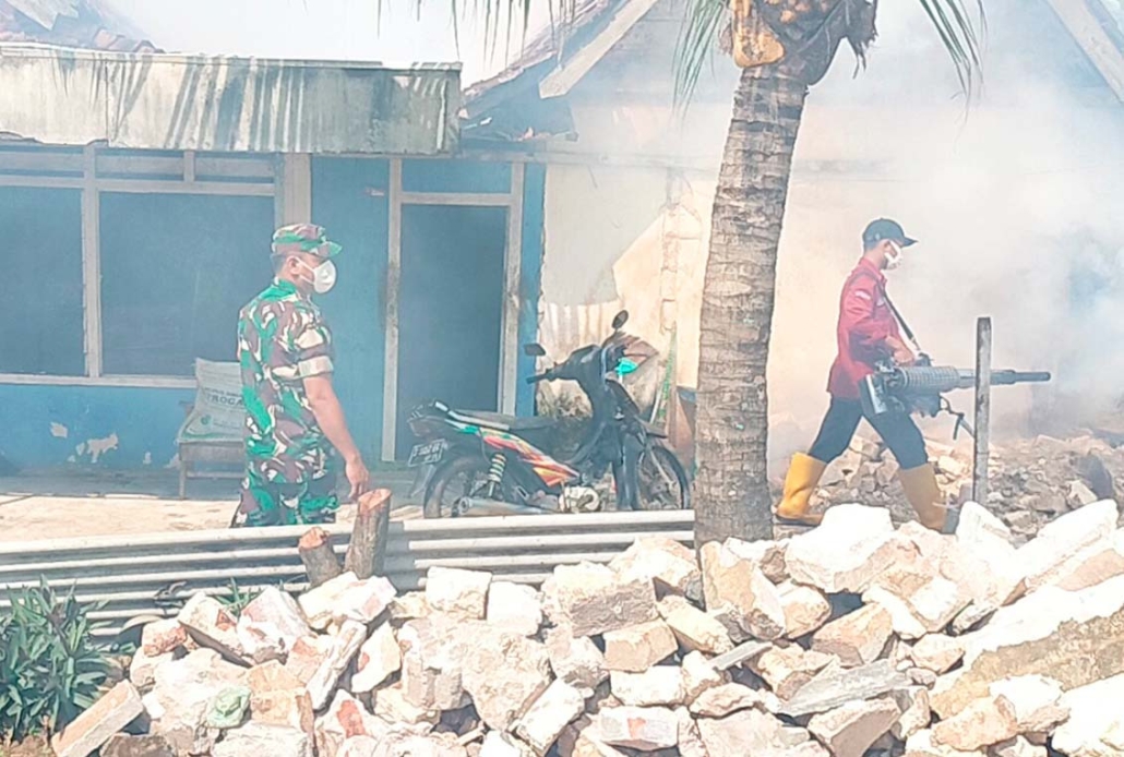 TUBAN, – Upaya pencegahan penyebaran penyakit Demam Berdarah Dengue (DBD), Babinsa Jarorejo Koramil 0811/14 Kerek Sertu Munawan bersama petugas Dinas Kesehatan melaksanakan fogging guna mencegah perkembang biakan nyamuk Aides Aegepty di Wilayah binaan Desa Jarorejo Kecamatan Kerek Kabupaten Tuban.