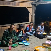 Momen penuh haru ini berlangsung sederhana namun sarat makna. Anggota Pos dan warga duduk melingkar, menikmati tumpeng dan hidangan khas yang disiapkan bersama.