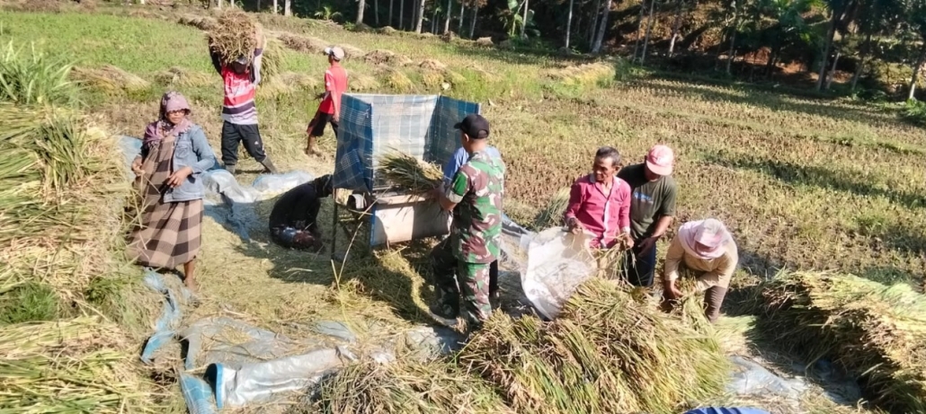 Dukungan Babinsa dalam Ketahanan Pangan: Panen Padi di Desa Lumbang Berhasil dengan Baik.