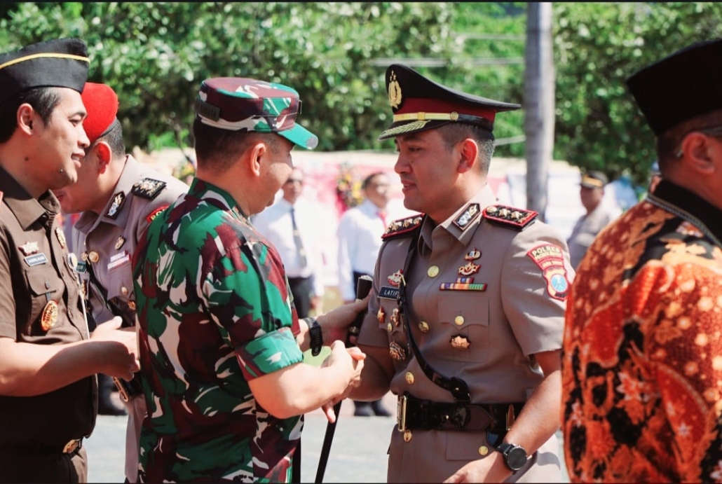 Probolinggo – Dandim 0820/Probolinggo Letkol Arh Iwan Hermaya bersama jajaran forum kordinasi pimpinan daerah (Forkopimda) Kabupaten Probolinggo menghadiri serah terima jabatan (Sertijab) Kapolres Probolinggo dari AKBP Wisnu Wardana kepada AKBP M. Wahyudin Latif, Sabtu (12/7).