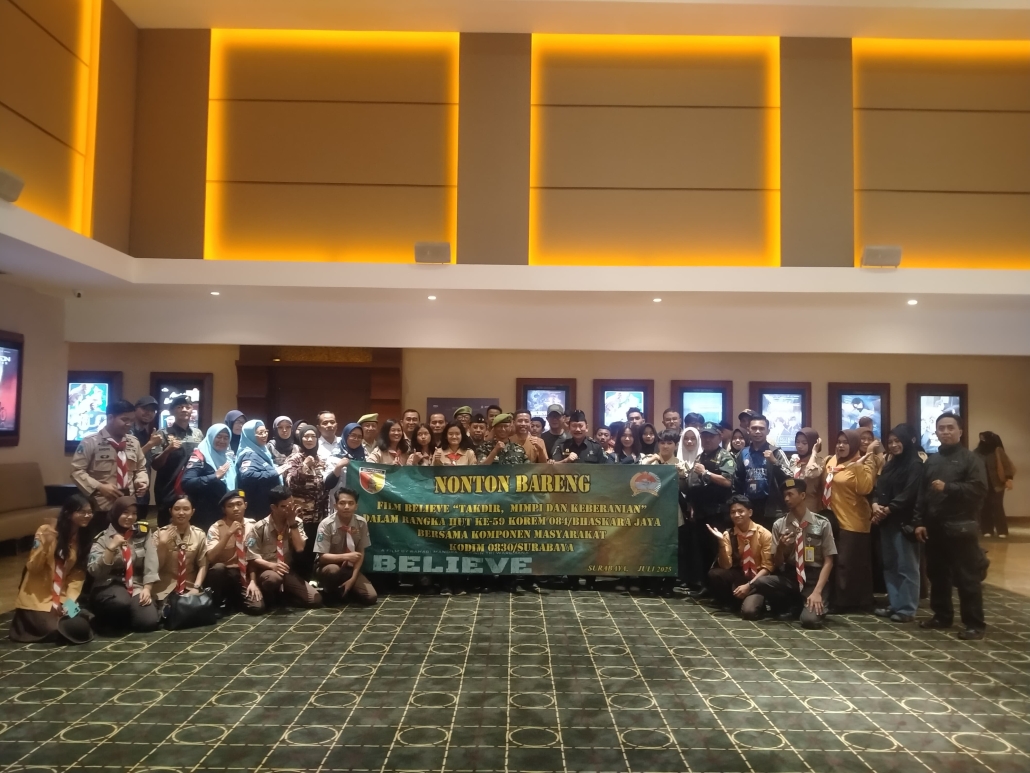 SURABAYA – Dalam rangka memperingati Hari Ulang Tahun (HUT) ke-59 Korem 084/Bhaskara Jaya, ratusan masyarakat memadati bioskop di Grand City Mall Surabaya Jl. Walikota Mustajab No.1, Ketabang, Kecamatan Genteng, Selasa (29/7/2025). Kegiatan ini menjadi salah satu rangkaian acara yang digelar Kodim 0830/Surabaya untuk menumbuhkan semangat nasionalisme dan cinta Tanah Air.