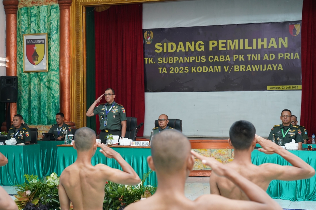 Jember,- Pangdam V/Brawijaya, Mayjen TNI Rudy Saladin, M.A, memimpin berlangsungnya siding pantukhir pusat penerimaan Secaba PK TNI-AD tahun 2025 di Rindam V/Brawijaya Jember. Kamis (03/07/2025).