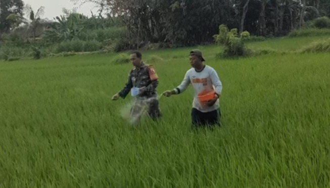 Pendampingan ini dilakukan di lahan sawah milik anggota Kelompok Tani Sri Sedono yang tengah memasuki masa pemupukan. Serda Saiful turut membantu proses penaburan pupuk agar tanaman padi tumbuh subur dan produksi hasil panen dapat maksimal.