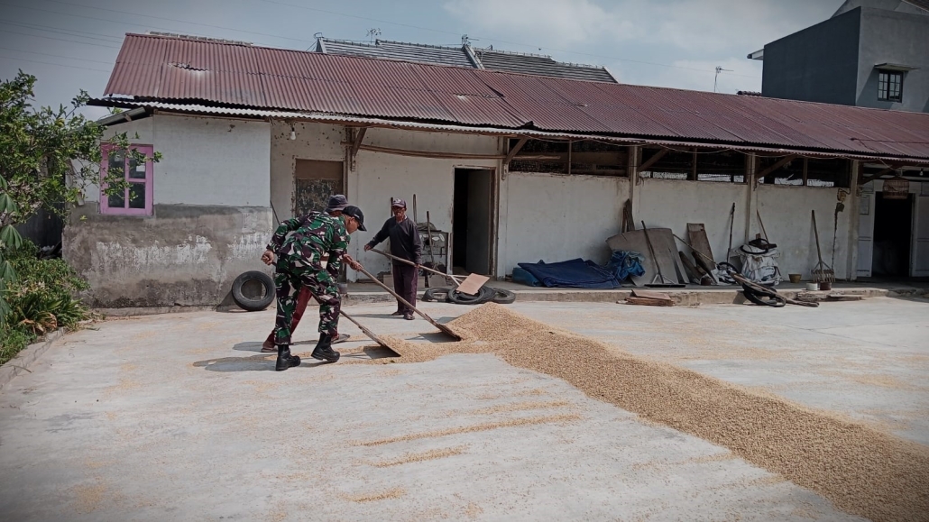 Gabah dijemur di halaman milik kelompok tani dengan cara tradisional di halaman rumah serta dibntu terik matahari. Para petani mengaku terbantu dengan kehadiran Babinsa yang turut aktif sejak panen hingga pasca panen.