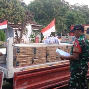 Sementara yang sudah ada bahan material bangunan berupa Semen, keramik dan kasiboard kami distribusikan ke sasaran secara bertahap sambil menunggu bahan material yang lain ada,” ucap Koptu Heri. S.