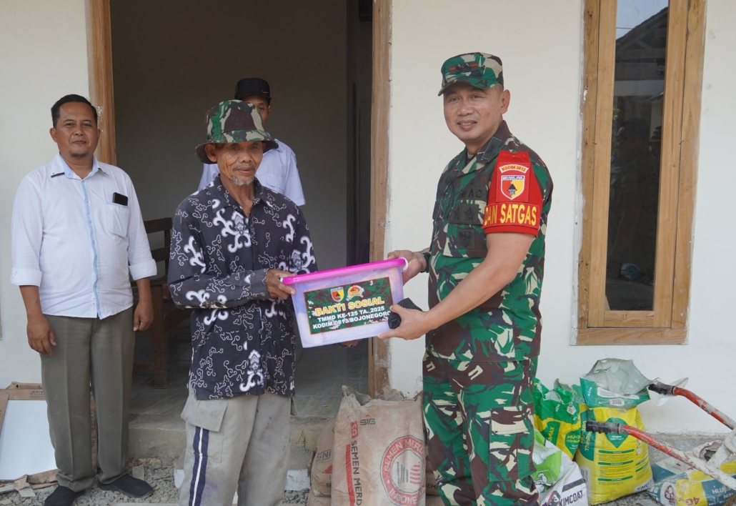 Dalam peninjauannya, Dansatgas TMMD ke- 125 Kodim 0813 Bojonegoro Letkol Czi Arief Rochman Hakim, SE., MM., beserta rombongan secara simbolis memberikan bantuan berupa paket sembako kepada warga penerima manfaat bantuan bedah rumah pada program TMMD ke- 125 tahun 2025.