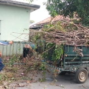 Tampak dalam kegiatan, berbagai tumpukan ranting pohon dan sampah organik dikumpulkan dan diangkut menggunakan kendaraan roda tiga untuk dibuang ke tempat penampungan sampah.