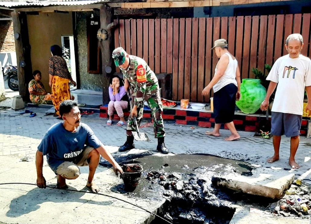 Babinsa bersama masyarakat bergotong royong membersihkan saluran air untuk memperlancar aliran sekaligus mencegah terjadinya genangan saat musim hujan. Upaya tersebut mendapat dukungan penuh dari warga yang turut aktif bekerja sama.