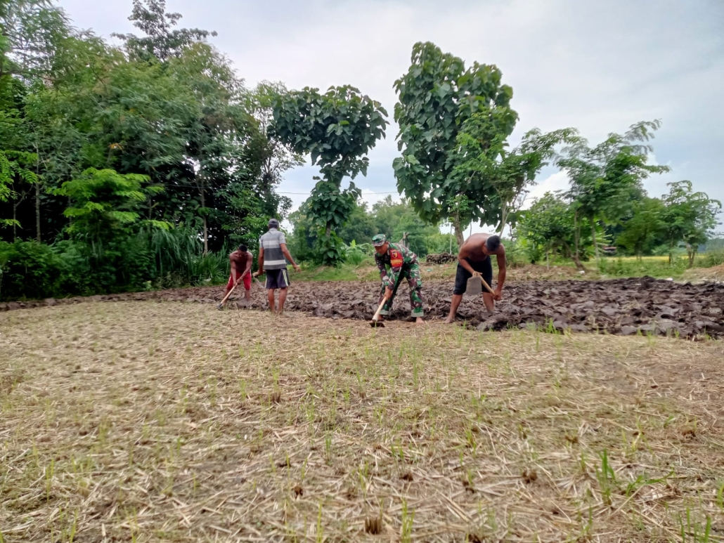 Dengan alat sederhana seperti cangkul, Babinsa dan warga bekerja bergantian mengolah lahan yang akan ditanami jagung. Kebersamaan tersebut memperlihatkan kepedulian TNI dalam membantu masyarakat mengembangkan sektor pertanian sebagai penopang perekonomian desa.