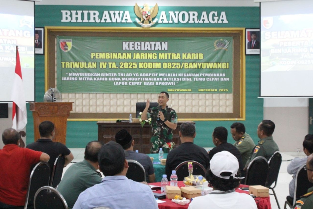BANYUWANGI — Kodim 0825/Banyuwangi menggelar Pembinaan Jaring Mitra Karib Triwulan IV Tahun 2025 di Aula Makodim, Rabu (03/12/2025). Kegiatan ini merupakan langkah strategis TNI AD dalam memperkuat sistem kewaspadaan wilayah melalui jaringan mitra teritorial.