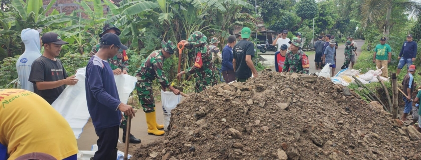 Kerja bakti ini melibatkan anggota Koramil serta warga setempat yang bahu-membahu membuat tanggul guna memperbaiiki jalan tsb. Material yang digunakan, seperti Tanah dan karung disediakan secara swadaya oleh masyarakat dengan dukungan pemerintah desa.