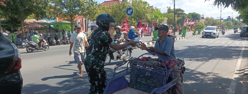 Babinsa secara langsung menyusuri sejumlah titik dengan mengendarai sepeda motor sambil membagikan nasi kotak kepada tukang becak, pemulung, tukang parkir, pengemis, dan warga lainnya yang membutuhkan.