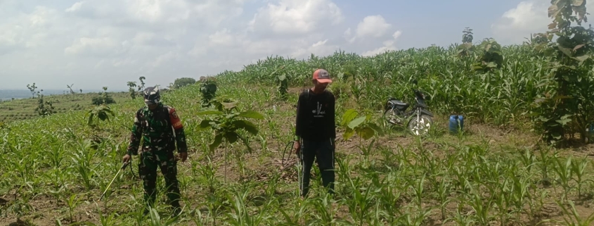 “Keberadaan hama ataupun gulma sangat mengganggu tanaman jagung pada masa pertumbuhan hingga masa pematangan, harus dibasmi melalui penyiangan ataupun penyemprotan dengan herbisida tertentu, karena bila dibiarkan akan mengakibatkan tanaman jagung kekurangan unsur hara, air dan cahaya yang berdampak pada menurunnya produksi hasil panen”, ujar Babinsa usai menyemprot.