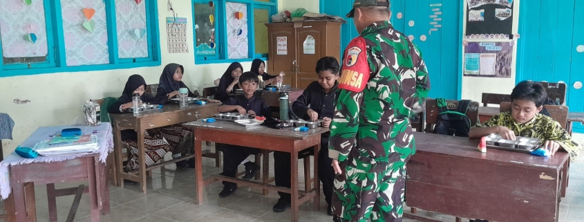 BANYUWANGI – Babinsa Desa Sumbermulyo Sertu Guntari aktif mendampingi Program Makan Bergizi Gratis di sekolah-sekolah wilayahnya, Senin (08/12/2025). Pendampingan ini memastikan penyaluran nasi, lauk-pauk, buah dan susu berjalan aman, tertib serta tepat sasaran demi mendukung gizi dan kecerdasan generasi muda.