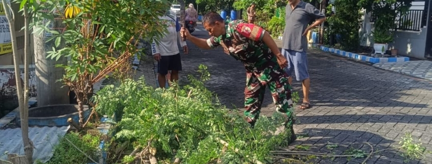 Babinsa Baratajaya Bersama Warga Laksanakan Kerja Bakti Perampingan Pohon Lingkungan