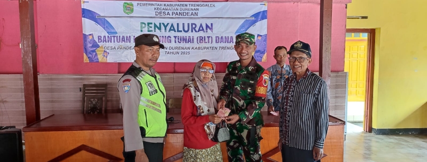 TRENGGALEK – Aparat kewilayahan menunjukkan peran aktif mendukung perlindungan sosial pemerintah. Babinsa Pandean Koramil 0806-03/Durenan Serka Guguk Cahyono bersama Bhabinkamtibmas Aipda Muslihudin mendampingi penyaluran BLT Dana Desa kepada warga kurang mampu Desa Pandean, Kecamatan Durenan, Jumat, sebagai wujud sinergi pengamanan program prioritas nasional.