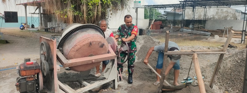 Madiun, – Babinsa Desa Dagangan, Koramil 0803/14 Dagangan, Peltu Munif Dwi Erwanto, melaksanakan kegiatan Karya Bakti (Karbak) berupa pembuatan gapura di jalan masuk Balai Desa Dagangan, Kecamatan Dagangan, Kabupaten Madiun, Senin (3/2). Kegiatan ini bertujuan untuk memperindah tampilan desa serta memberikan identitas yang lebih jelas bagi masyarakat dan pengunjung.