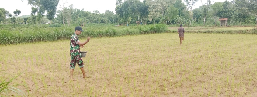 PAMEKASAN – Babinsa Desa Klompang Barat, Serda Ach. Fadallah, menunjukkan kepedulian terhadap masyarakat desa dengan membantu Rahmat, seorang petani di Dusun Sumber Bates, dalam pemberian pupuk pada tanaman padi.