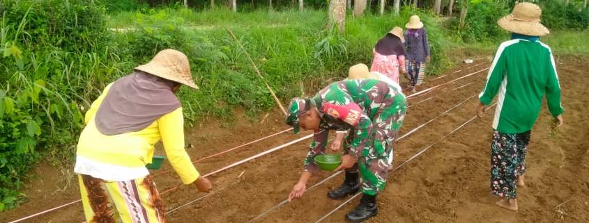SUMENEP – Memasuki musim penghujan, Babinsa Koramil 0827/07 Guluk Guluk Kopka Siswoyo dan para petani di Desa Karangsokon, Kecamatan Guluk Guluk, Kabupaten Sumenep mulai menanam jagung.