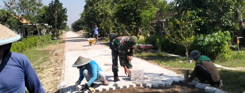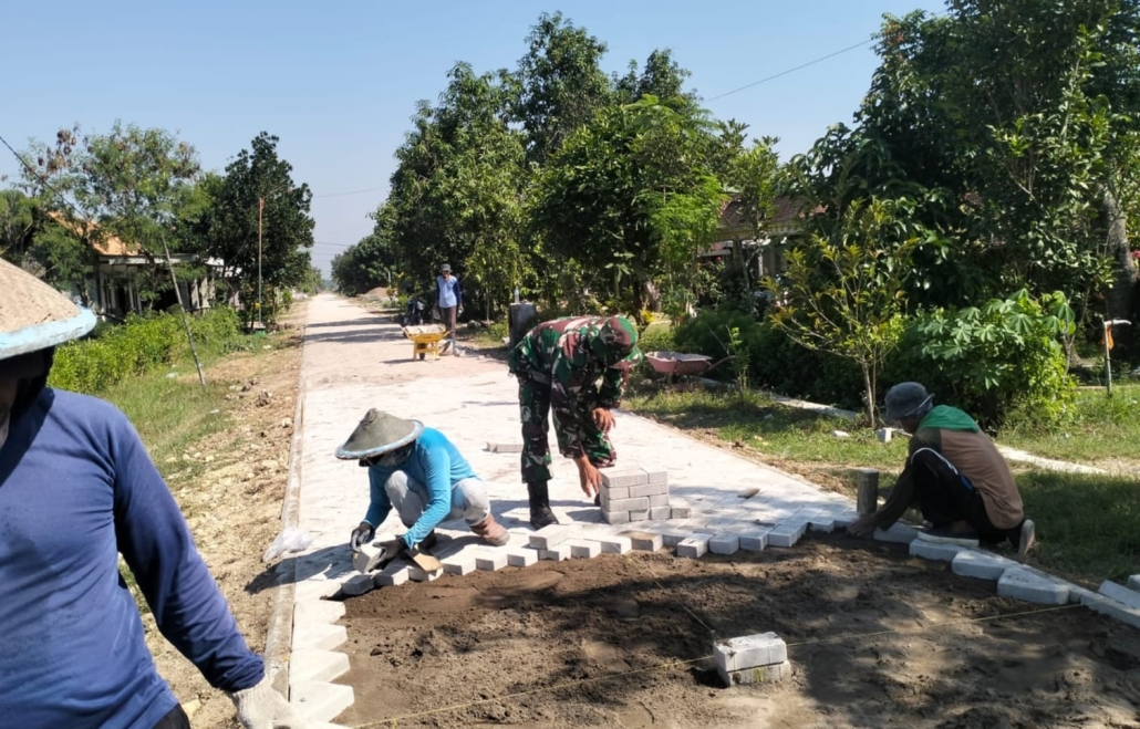 Babinsa Kedungrejo Ajak Warga Kerja Bakti Pemasangan Paving Jalan untuk Desa