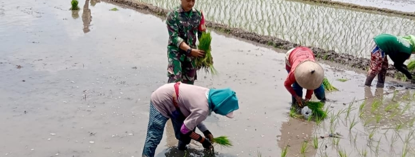 Kegiatan pendampingan dilakukan dengan turun langsung ke sawah membantu proses penanaman padi sekaligus memotivasi petani. Aksi Babinsa ini memperkuat semangat kerja, menjaga kesinambungan tanam, dan memastikan aktivitas pertanian berjalan lancar sesuai kondisi lahan serta kesiapan sarana.