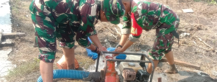 Babinsa yang hadir terlihat turun langsung ke lapangan bersama petani, membantu mengoperasikan pompa air agar air dapat mengalir ke sawah secara optimal.
