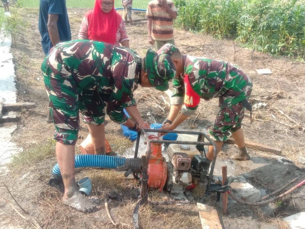 Babinsa yang hadir terlihat turun langsung ke lapangan bersama petani, membantu mengoperasikan pompa air agar air dapat mengalir ke sawah secara optimal.