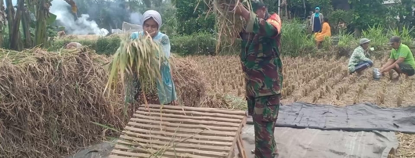 Bertempat di lahan pertanian milik salah satu warga di Desa Karanganyar, Kecamatan Bantaran, Kabupaten Probolinggo. Koramil 0820/04 Bantaran melaksanakan komunikasi sosial dan patroli dengan melakukan pendampingan dalam proses panen padi.