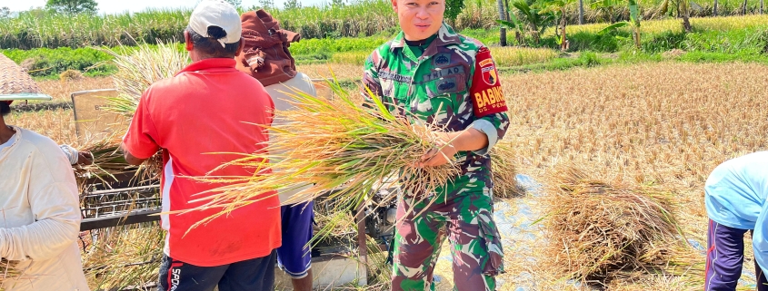Babinsa Koramil 0822-14/Botolinggo Dukung Ketahanan Pangan Lewat Pendampingan Panen Padi di Bondowoso
