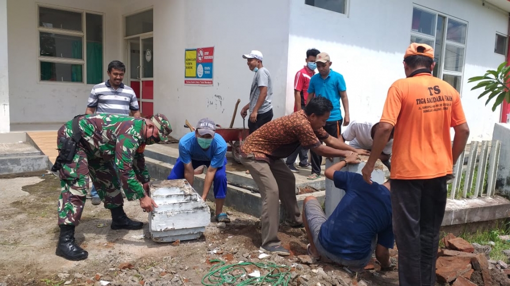 Babinsa Koramil 0824/13 Rambipuji Kerja Bakti Bersama Masyarakat Benahi Pagar Puskesmas Roboh