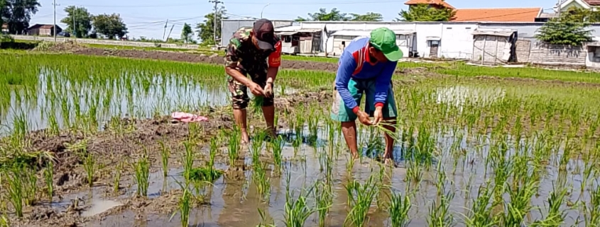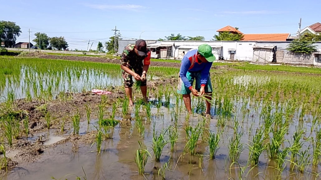 Gresik – Dalam rangka mendukung program Ketahanan Pangan (Hanpangan), Babinsa Koramil 0817/09 Balongpanggang, Sertu Iwan S., melaksanakan kegiatan penanaman padi bersama warga di persawahan milik Bapak Siswanto, perangkat Desa Wahas, Kecamatan Balongpanggang, Kabupaten Gresik.